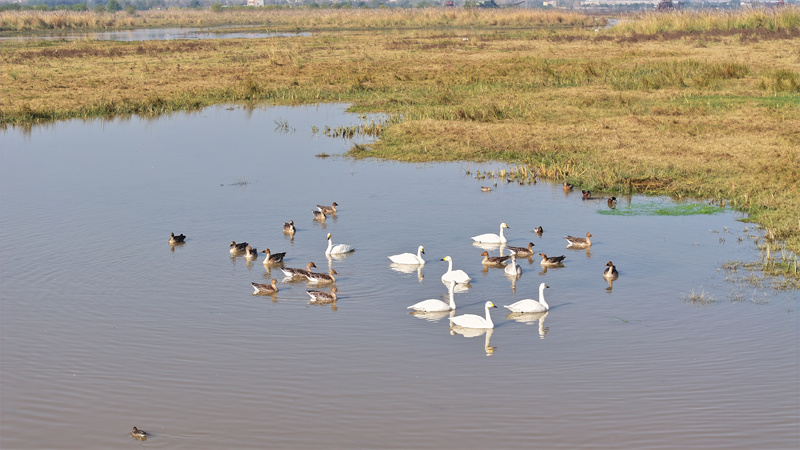 小天鹅属国家二级保护动物,主要以水生植物为食,每年10月南迁越冬。此前,监测人员还曾记录到小天鹅与豆雁(国家二级保护动物)“同框”的场景。这些对水质和生态环境极为敏感的指示物种接连现身,标志着万洋洲湿地生态环境质量正持续向好。