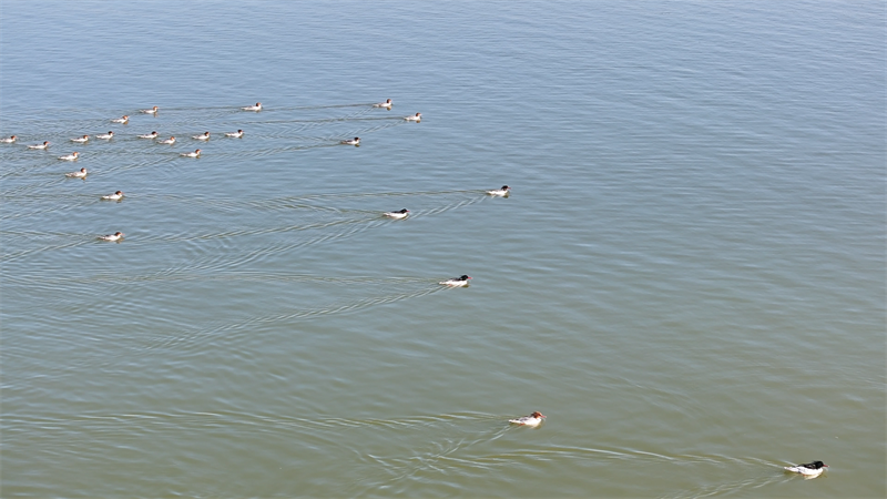 在宜城万洋洲国家湿地公园一处水域,60多只中华秋沙鸭在清澈的水面上嬉戏、觅食,时而振翅高飞、时而悠然游动,为冬日的湿地公园增添了一抹灵动之美。