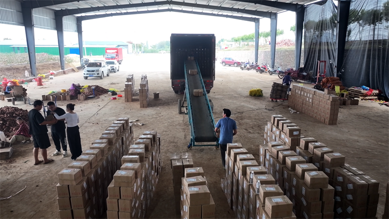 产业发展,销售为要。在板桥店镇新街村,种植户王虎正将40吨紫蜜薯装车发往北京;电商严伟的现代化基地里,工人忙着分拣包装,线上订单销往全国。从顺带销售到年销千万斤,电商让红薯卖得更远。