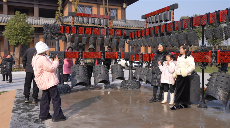 园区内,游客们三五结伴,漫游其中,或在修复的西城垣旁流连驻足,或在仿楚建筑前拍照打卡。礼乐广场上,一组仿古编钟吸引不少人围观,游客们轮流尝试,孩子们在家长陪同下小心翼翼敲击,钟声清越,穿越时空。现场笑声与钟声交织,历史仿佛触手可及。