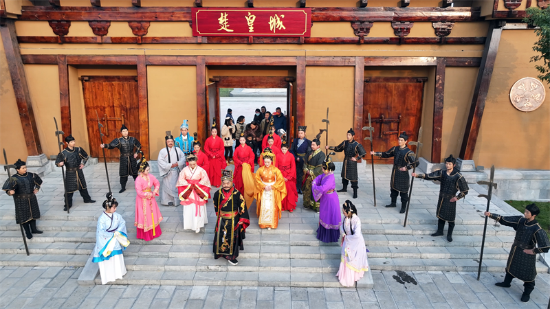 在楚皇城大遗址保护开发项目现场,演员们身着华丽古装,将“楚庄王”巡游的盛大场景搬上舞台,上演一场跨越千年的古今文化对话。在全副武装士兵的护卫下,“楚庄王”游览楚皇城,并与现场游客和广大群众挥手致意。在一个个互动中,现场氛围被推向高潮,大家纷纷掏出手机,与“楚庄王”合影留念,拍下精彩瞬间。