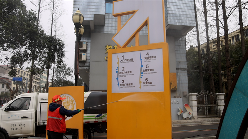 工作人员清洗道路指引牌