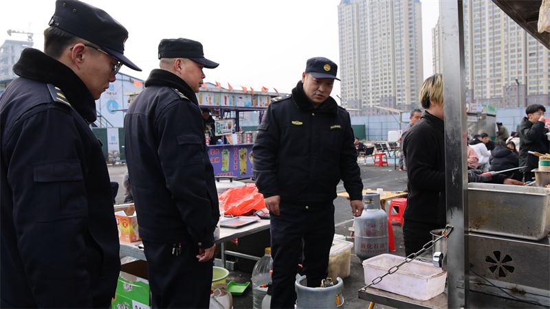 城管执法队员检查夜市摊位燃气安全