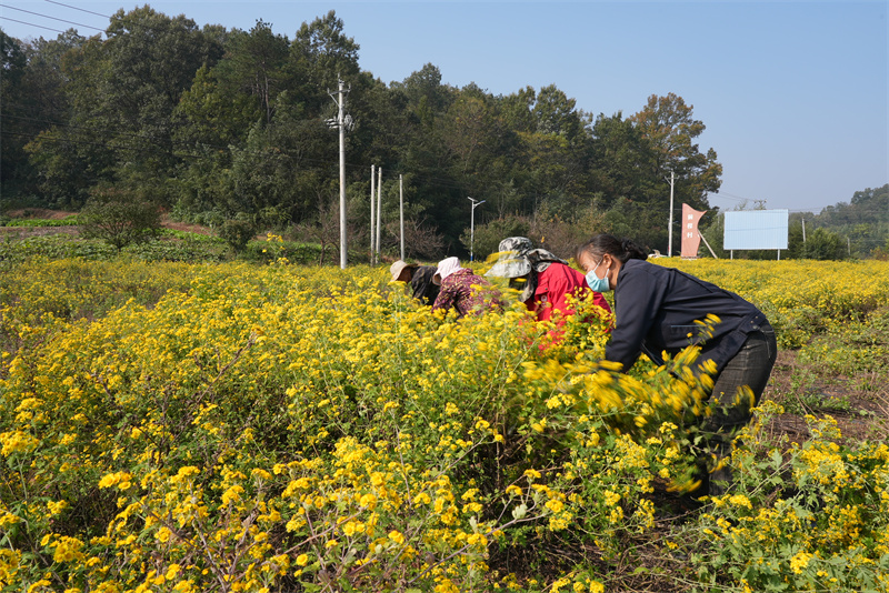 “在家门口就能干活,一天能挣一百多块钱,还不耽误照顾家里,比外出打工强多了。”正在收割菊花的刘猴镇新垱村六组村民李正忠高兴地说。