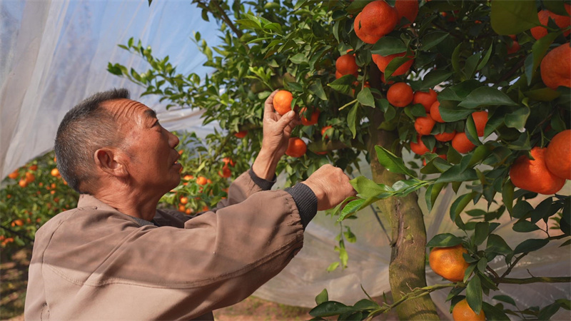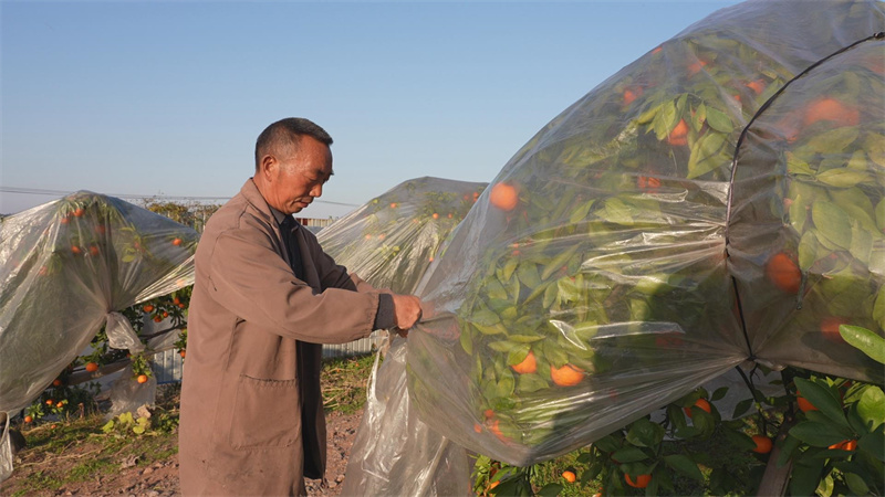 “盖膜的最大好处主要是防霜冻,起到保鲜的作用,让客户什么时候来都能采摘新鲜的橘子。”有着多年种植经验的陈庭和介绍,这已是他连续第六年采用覆膜防冻技术。薄膜能在树冠周围形成小气候环境,有效防止霜冻侵害,让柑橘得以在树上保鲜至春节前后。