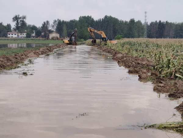 强降雨造成南营办事处五连村内涝严重,南营办事处在确保群众安全的前提下,组织人力机械抢排积水。由于该村地势低洼,附近其它村庄积水又继续流入,五连村加大机械开挖沟渠,加快排涝进度。