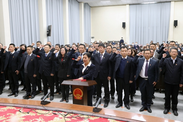 市长肖平将左手抚按在宪法文本上,右手举拳,领读誓词。宣誓人员并排站在领誓人身后,举起右拳庄严宣誓:忠于中华人民共和国宪法,维护宪法权威,履行法定职责,忠于祖国、忠于人民,恪尽职守、廉洁奉公,接受人民监督,为建设富强、民主、文明、和谐的社会主义国家努力奋斗!