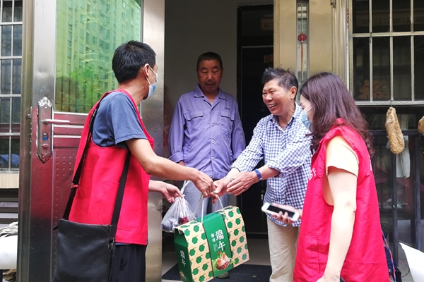 本网讯通讯员胡龙华报道:6月12日,乔家营社区嘉豪悦府小区“双报到”党支部开展“情暖端午”慰问活动,为小区空巢老人,留守儿童、残疾人等16户家庭送去节日的祝福。